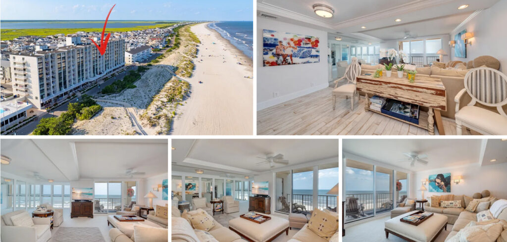 The renowned “Condo in White” has been featured and awarded for its exceptional design. This beachfront retreat is a rare, once-in-a-lifetime opportunity – completely renovated and turnkey for its next owner. Located in the North Tower of “The Spinnaker,” it is one of only two 4-bedroom condos in the entire building. Upon entry, you’re immediately greeted by picturesque ocean views, enhanced by floor-to-ceiling windows and doors. The owners collaborated with an architect and designer to thoughtfully reconfigure the layout, enhancing the space’s functionality. The open-concept main living area features a spacious kitchen with upscale finishes, stainless steel appliances, quartz countertops, an Arabescato Marble backsplash, and a custom walnut butcher block island. Just off the kitchen is a full-sized laundry room with built-in cabinetry for added storage. The kitchen leads into the dining area and expansive living room – ideal for entertaining and relaxing. Sliding doors lead to an oversized deck, perfect for enjoying the ocean breeze and views. Floor-to-ceiling mirrors in the living room reflect the ocean views from various viewpoints. Down the hall, you’ll find a half bath and four bedrooms, including two full bathrooms. The first bedroom faces the ocean and opens directly to the deck. The primary suite also faces the ocean and features a spa-like bathroom. The shower includes a digital control interface that allows you to set the water temperature and operate its seven jets/heads. The vanity countertop is Cambria Marble, while the shower is finished in Arabescato Marble with blue mosaic accents. On the west side, two additional bedrooms offer custom built-in bunk beds with integrated storage that can accommodate children and guests. Another full bath includes a walk-in shower with mosaic tile and multiple shower heads. Spinnaker offers amenities unmatched by other buildings in Sea Isle City or surrounding shore towns, including a rooftop pool on the 2nd floor and private pickleball/tennis courts recently added. The building is open year-round and features on-site property management. The financially strong association is fully committed to ongoing building maintenance, making ownership truly low maintenance. Access to the building is convenient, with elevators beginning at the ground-level parking garage. The unit includes two parking spaces – one covered interior and one exterior. The home is being sold fully furnished and decorated, excluding personal items. Call today for a private showing.