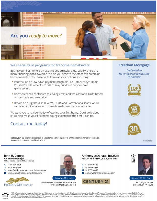 Are you ready to move? Call John Coneys of Freedom Mortgage, and me to find out more about what we can offer you as a first-time homebuyer. #RealEstate #Realtor #FirstTimeHomeBuyer #ReadytoMove #FreedomFast #PreApp #LetFreedomHelp
