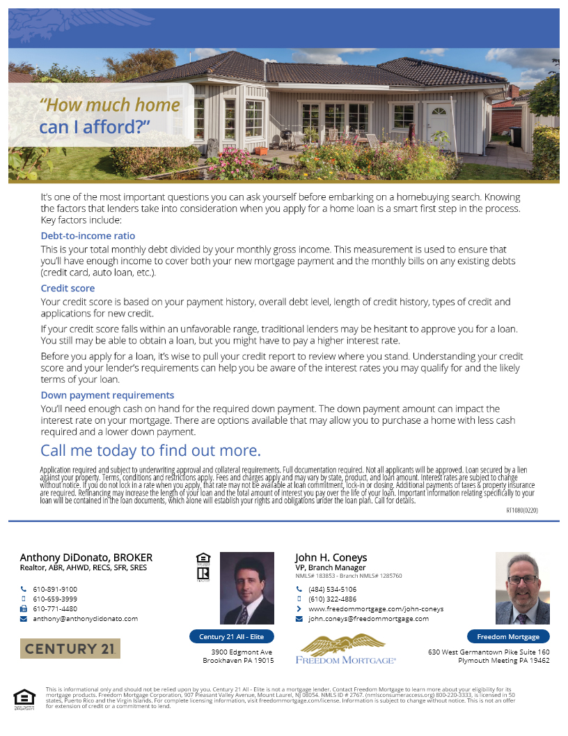 When figuring out how much home you can afford there are three factors to take into consideration: Debt-to-income-ratio, Credit score and Down payment requirements. With the help of myself and John Coneys of Freedom Mortgage, (NMLS# 183853 – 610.322.4886) we can explore homebuying options to help you meet your goals. #RealEstate #Realtor #HomePurchase #BuyersMarket #FreedomFast #PlymouthMeetingFM